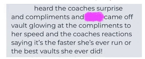“My vault has gotten a lot faster since working with Coach Sarah. She really focuses on form and helps fix mistakes in ways we can understand.”