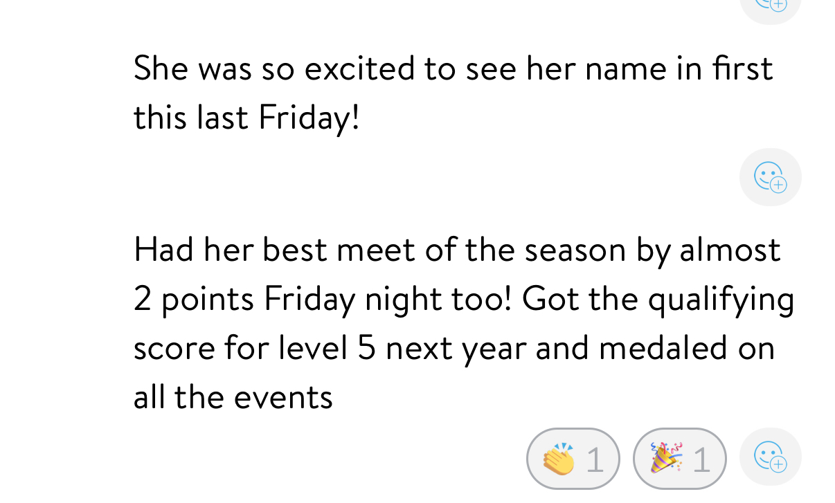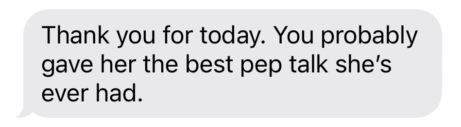 “Last week her coach said something that normally would’ve made her cry. But she took the criticism and actually told me about it! Normally it’s a silent car ride after practice.”